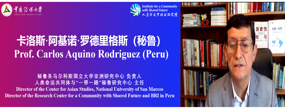 秘鲁圣马尔科斯国立大学亚洲研究中心负责人、人类命运共同体与“一带一路”秘鲁研究中心主任卡洛斯·阿基诺·罗德里格斯教授在主题为《在充满不确定性的世界中,可持续发展和共同未来需要什么?》的演讲中指出,首先要继续保持国际贸易与投资体系开放,避免保护主义或区块划分,保障世界经济增长;其次,要坚持多边主义,在联合国等国际组织带领下以和平方式解决国际冲突;最后,秘鲁等拉美发展中国家应与中国拓展合作关系,努力改革由西方国家主导的国际货币体系,增强发展中国家在国际社会的话语权。