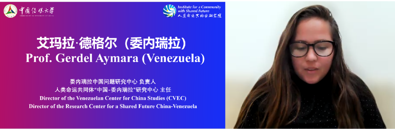 委内瑞拉中国问题研究中心负责人、人类命运共同体“中国-委内瑞拉”研究中心主任艾玛拉·德格尔教授的发言题目为《人类命运共同体“中国-委内瑞拉”研究中心:“命运共同体”理念的实践性经验》。德格尔教授基于委内瑞拉海外研究中心的工作成果,对中国心系世界提出的“人类命运共同体”理念下的三项“倡议”进行阐述,肯定其对拉美和加勒比国家合作发展具有重要意义。她举例说明中拉学术共同体的创建对中国与拉美和加勒比国家的文明对话和交流互鉴的促进作用,并期待人类命运共同体“中国-委内瑞拉”研究中心能够发展成为连接中拉进一步沟通合作的桥梁。