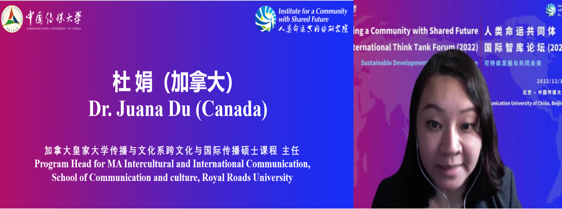 加拿大皇家大学跨文化与国际传播硕士课程主任杜娟博士从本土化视角阐释了《组织社群韧性与可持续发展》。她对当下全球所面临的疫情、全球化趋势衰退、能源与环境保护、退休潮、劳工行动主义等问题与新议题进行了探讨,从加拿大的历史文化语境出发,关注人类、自然、社群与社会发展的内在关联性和互动关系,围绕社群韧性与可持续发展的可能理论进行阐述,对人类命运共同体建设与可持续发展的积极意义进行了肯定。