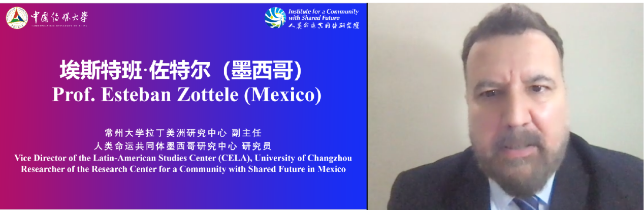 常州大学拉丁美洲研究中心副主任、人类命运共同体墨西哥研究中心研究员埃斯特班·佐特尔教授的演讲题目是《人文交流:跨文化交际能力与命运共同体建设》。他从文化交流维度提出理解与沟通是构建人类命运共同体的根本。佐特尔教授结合“一带一路”倡议框架下的跨文化交流实践,指出中国与拉美在跨文化交流过程中所面临的挑战并提出相应的解决路径。他强调,跨文化领导力对促进跨文化交流中的相互理解起着重要作用,不同民族和文化背景的人们应齐心协力携手解决共同面临的挑战,以最终实现构建共同未来的美好畅想。