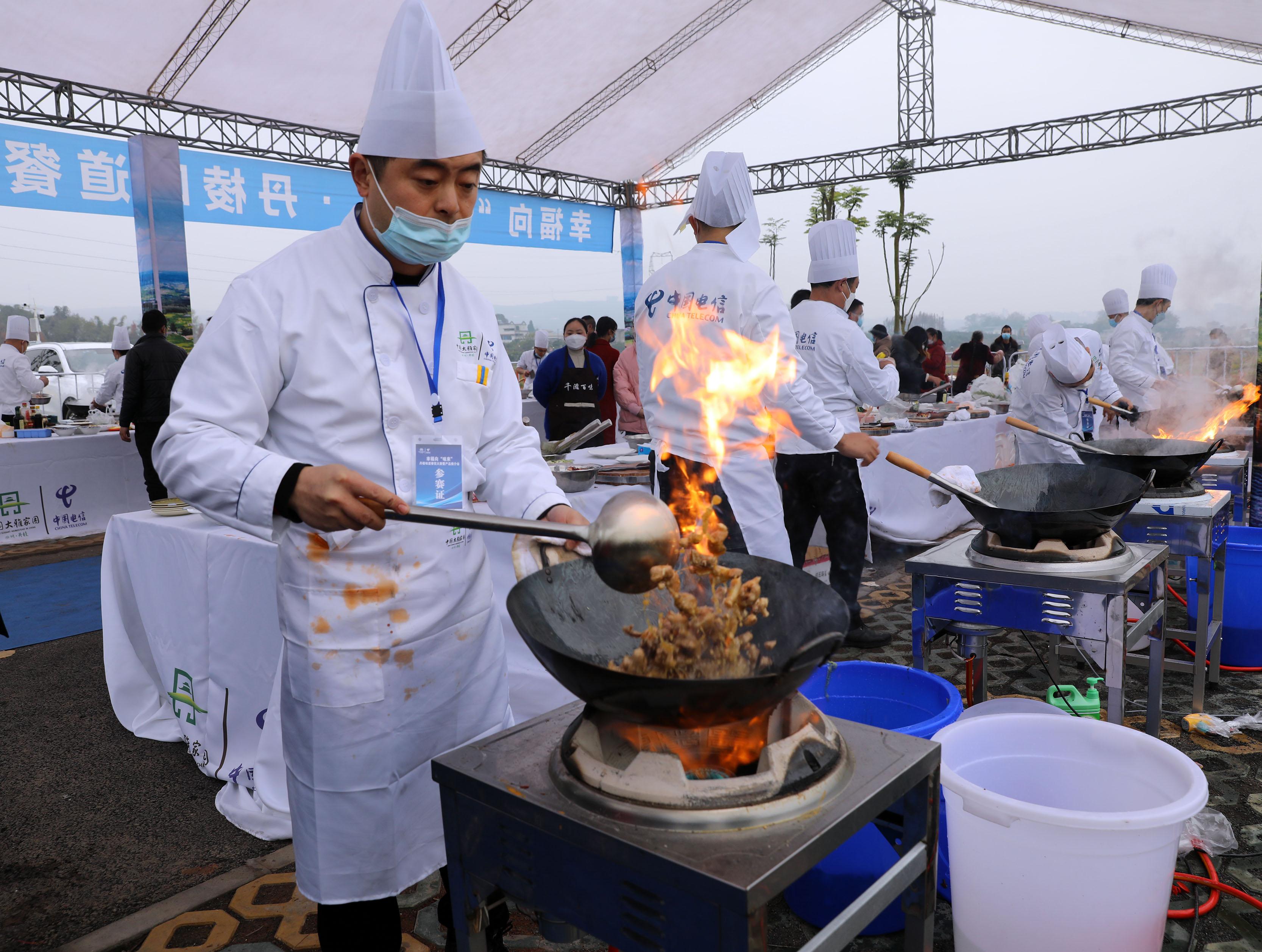 “桔橙茶香鸡步步高升、手撕鸡、乌鱼汤、红烧羊肉、钵钵鸡......”比赛现场,20个参赛餐饮企业及其20名主厨按照比赛要求,使出看家本领制作出各式佳肴,千方百计征服评委的味蕾。