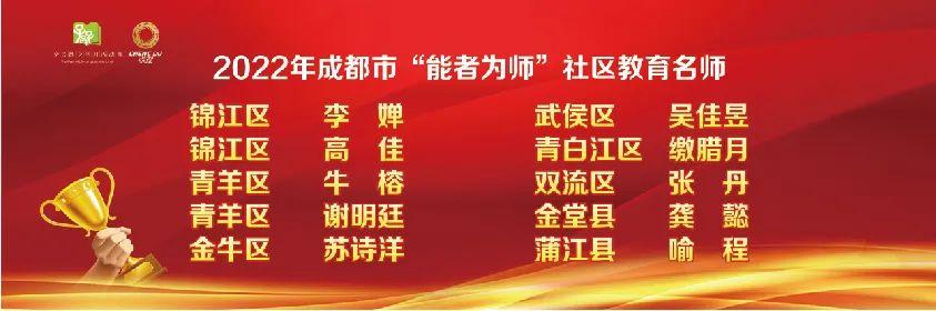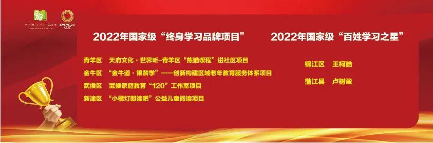 活动中宣读了全国、省级2022年“百姓学习之星”“终身学习品牌项目”获奖名单和2022年“能者为师”社区教育名师名单。锦江区王柯皓、李婵、高佳榜上有名。
