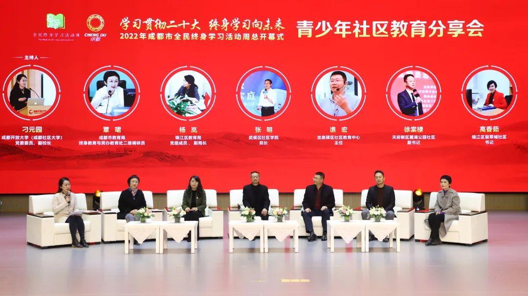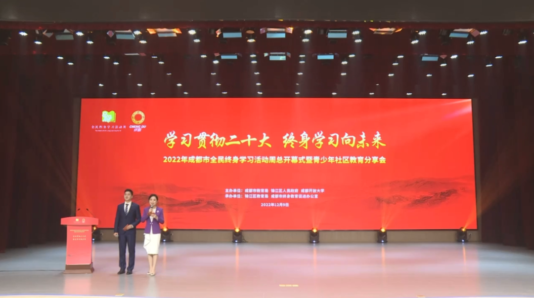 为深入贯彻落实党的二十大关于“推进教育数字化,建设全民终身学习的学习型社会、学习型大国”要求,生动展示成都市终身教育实践成效,积极营造全民学习、终身学习的社会氛围,12月9日,成都市2022年“全民终身学习活动周”总开幕式暨青少年社区教育分享会在锦江成功举行。本次活动以“学习贯彻二十大,终身学习向未来”为主题,由成都市学习型城市建设与社区教育联席会成员单位指导,成都市教育局、锦江区人民政府、成都开放大学主办,锦江区教育局、成都市终身教育促进办公室承办。通过线上展播的形式,近两千余人参加。
