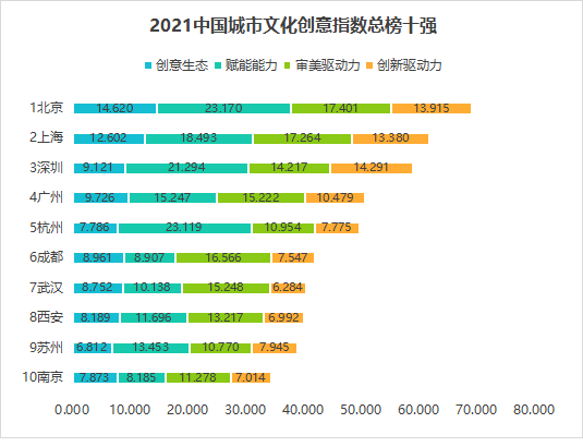 2021年度中国城市文化创意指数总榜十强城市,分别是:1北京(69.106)、 2上海(61.738)、 3深圳(58.923)、4广州(50.674)、5杭州(49.635)、6成都(41.981)、7武汉(40.422)、8西安(40.094)、9苏州(38.980)、10南京(34.350)。