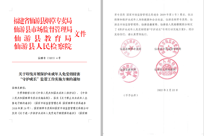 为持续加强保护未成年人免受侵害,共同守护成长。仙游县烟草、检察院、公安、市管、教育局等多家将根据联合发文的《关于开展保护未成年人免受烟侵害“守护成长”监管工作实施方案》的工作要求,持续运用法制宣传等方式深入宣传引导,并依托联动联防机制,最大化形成常态监管合力,坚持源头治理,综合整治,为青少年健康成长营造健康的环境,筑牢未成年人的安全屏障。