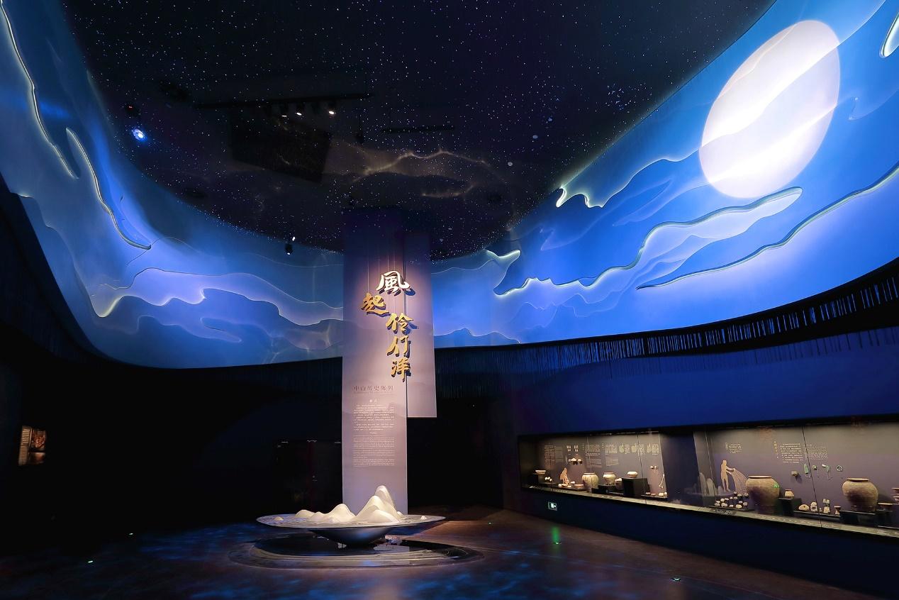 “风起伶仃洋”共划分为“海上香山蛮烟雨”“安民易俗成村聚”“渔户田庐水城国”“镜海扬帆立潮头”“近代中山开风气”五部分。为了在固定的空间里呈现行进的历史,新馆基于“再造历史现场”的策展理念,将“风起伶仃洋”展览空间设计为一系列田野情境,在其中通过艺术造景、文物组合、多媒体运用等方式,再现与演绎不同历史现场中人群的活动。展览从海洋文明中提炼出“波涛”作为主线元素,艺术化的波涛状弧线以空间结构、版面设计及灯光造型等方式贯穿全馆,串联章节,让观众更好地成为“戏中人”,随波逐浪于香山发展的历史舞台上,在各类人群的故事中感悟香山历史。