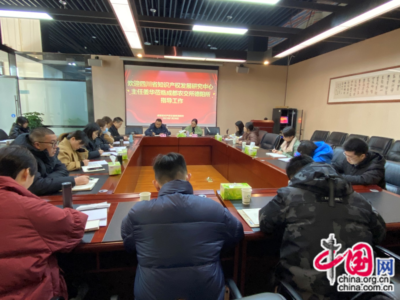 1月28日,四川省知识产权发展研究中心主任姜华到成都农交所德阳所座谈、交流,成都农交所德阳所总经理谢玉萍参加交流会。