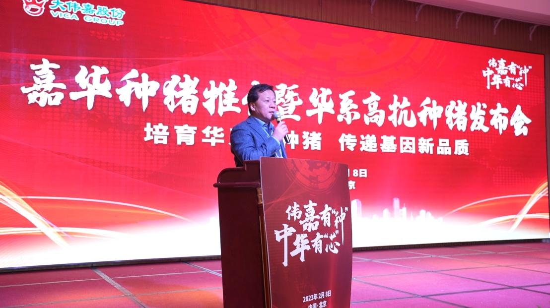 种业振兴,国之大纲。种源连着“国之大者”,为深入贯彻落实党中央、国务院关于打好种业翻身仗、实施种业振兴行动的决策部署,增强我国种猪育种核心竞争力,2023年2月8日,由北京市畜牧总站、平谷农业局和中国畜牧业协会支持、北京嘉华种猪育种有限公司和辽宁伟嘉农牧生态食品有限公司联合主办的“嘉华种猪推介暨华系高抗种猪发布会”在北京平谷农业中关村成功举办。北京市畜牧总站副站长及首席专家路永强、北京市平谷区农业农村局副局长唐彦彪、中国农业大学教授杨汉春、中国农业科学院北京畜牧兽医研究所研究员王立贤、中国农业大学动物医学院副教授张念之、大伟嘉股份董事长兼总裁廖峰、大伟嘉首席科学家兼养猪产业线副总经理赵宝凯等多位政府领导、行业大咖、多家种猪企业、规模养猪企业和业界养猪同仁近200人出席大会,共同见证嘉华种猪华系高抗种猪发布,共话种业振兴,共商种猪发展大计。