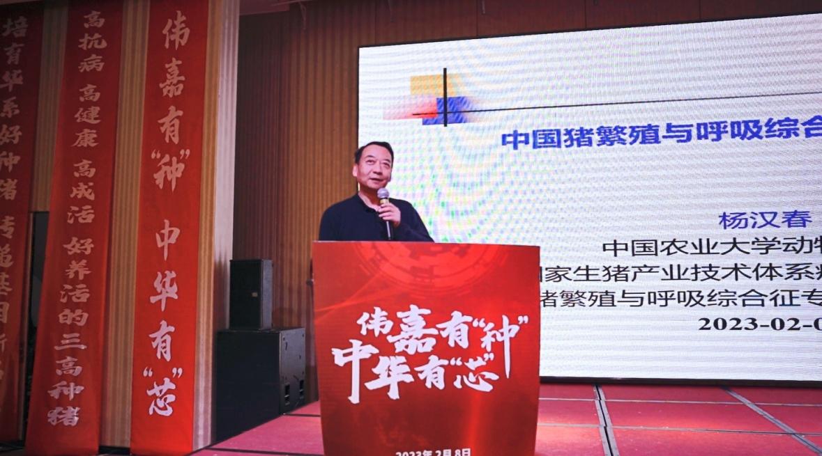 大咖论道,共话种猪。本次大会是2023开年种猪行业的顶级盛会,行业领导、业界学术大咖云集,共谋种猪大业,共享知识盛宴。会上,农业农村部动物防疫专家委员会猪病专家组组长、国家973项目首席科学家、中国农业大学杨汉春教授作了《中国蓝耳病流行形势与防控方案》主题报告,解读蓝耳病防控方案和净化秘诀,杨教授指出当前种业发展乘势而上,种业关键核心技术创新不断突破,引领中国种源跑出高质量发展的加速度。但同时蓝耳病目前仍是影响全球养猪业的重要疫情,导致生产成绩下降,影响猪场生产效益,种猪场必须要实现蓝耳病净化。猪场生物安全体系是实施蓝耳病净化的核心保障。大伟嘉在蓝耳病防控、净化方面取得了不错探索。