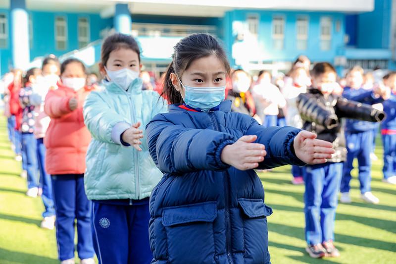兔年到,蹦蹦跳,身康体健一起跳。全体师生伴随着音乐动起来,跳起来,蓝色的操场上回荡着欢声笑语。