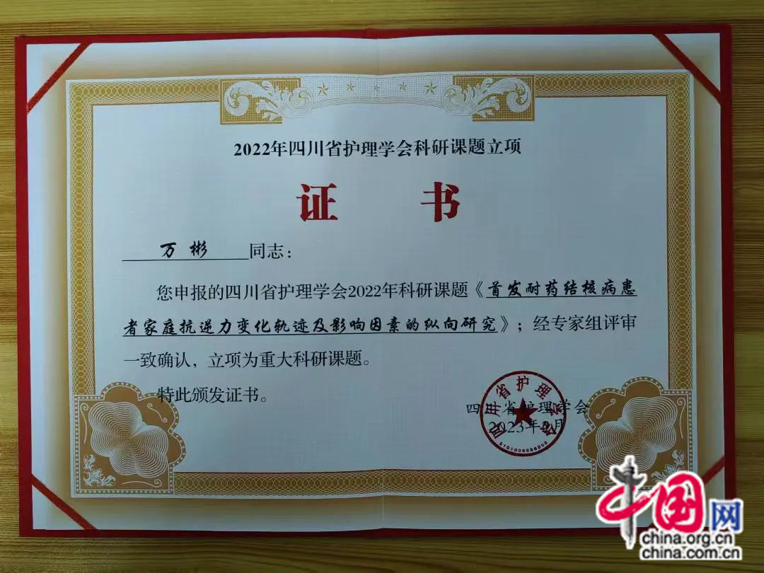 2023年2月24日上午,四川省护理学会召开了第十届理事会第五次会议,公布并表彰了2022年四川省护理学会立项的11项重大科研课题,成都市公卫中心护理部主任万彬申报的《首发耐药结核病患者家庭抗逆力变化轨迹及影响因素的纵向研究》立项为重大科研课题。