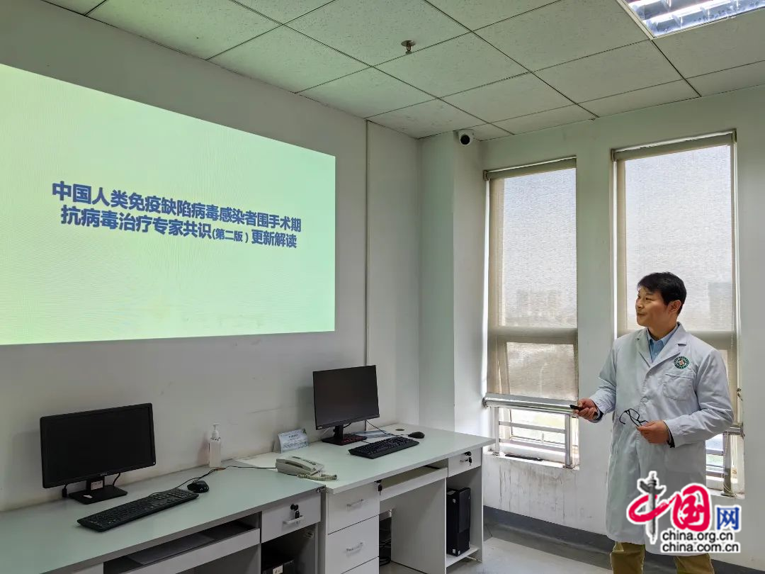 随后,张强教授在魏国主任的陪同下查房,重点了解肝癌/艾滋病合并恶性肿瘤的管理模式,讲授《中国人类免疫缺陷病毒感染者围手术期抗病毒治疗专家共识(第二版)更新解读》,并与医生们就临床中遇到的特殊情况展开热烈讨论。在读书会环节,外二科主治医师赵勇主讲《肝脏解剖与肝移植方式简介》,张强教授在点评中指出艾滋病患者的肝移植是国内器官移植领域的一个热点和难点,值得关注。