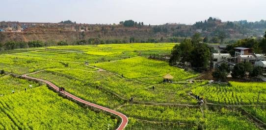 盘龙村是四川省仁寿县青岗粮油现代园区的核心组成部分,依托村内“四川十大油菜花观赏基地”——青岗·菜花坞,成功实现以农造景、以景带旅、以旅促农的农旅融合发展格局。目前正是2000余亩油菜花的盛花期,不少游客前来赏花,当地旅游也迎来了小高峰。