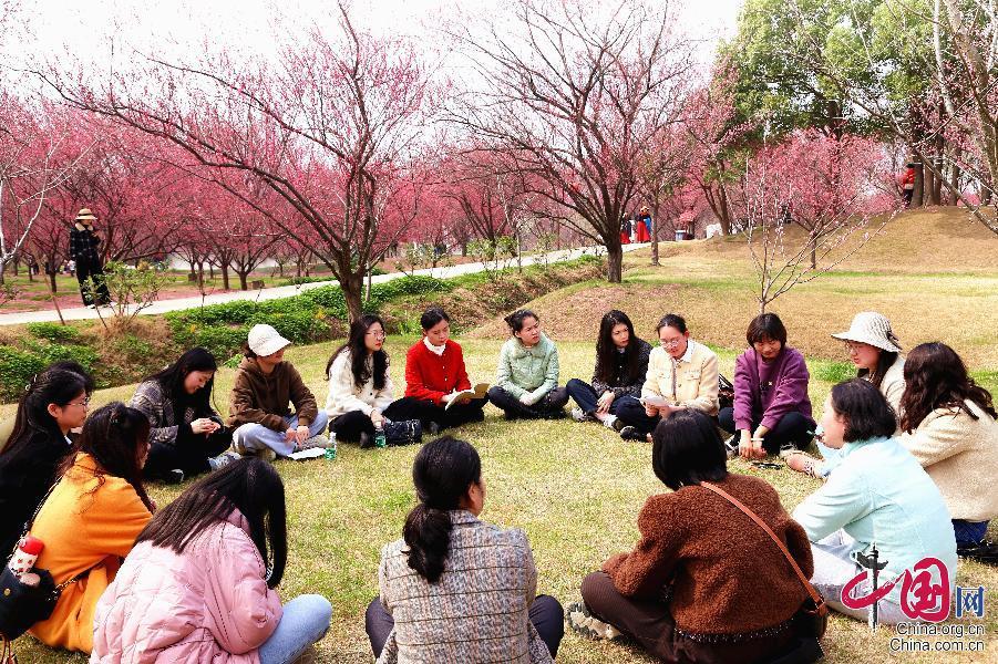信息爆炸的时代,读一本好书能使人静下心来,沉淀自己。大家围坐在草地上,分享着自己最喜爱的书籍片段,从家庭、教育、工作、为人处世的态度等方面交流心得体会。花瓣从头顶飘落,撒了满身满地,仿佛把梅香也一并刻入灵魂,这一刻,她们只是她们自己,俗世纷争已在九霄云外。