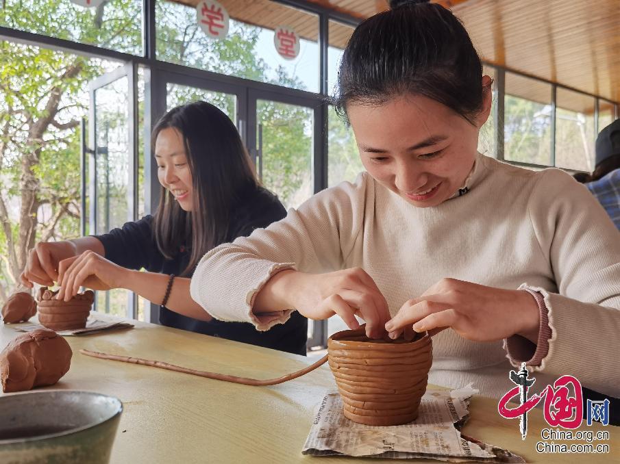 金家窑·驿“郢城泥陶”体验中心,在老师的现场指导下,检花们通过陶艺捏塑手法完成泥陶的造型创作,花篮、花盆、酒壶、茶杯……一个个作品诞生,或精致或随意,有人暗暗窃喜,有人哈哈一笑。