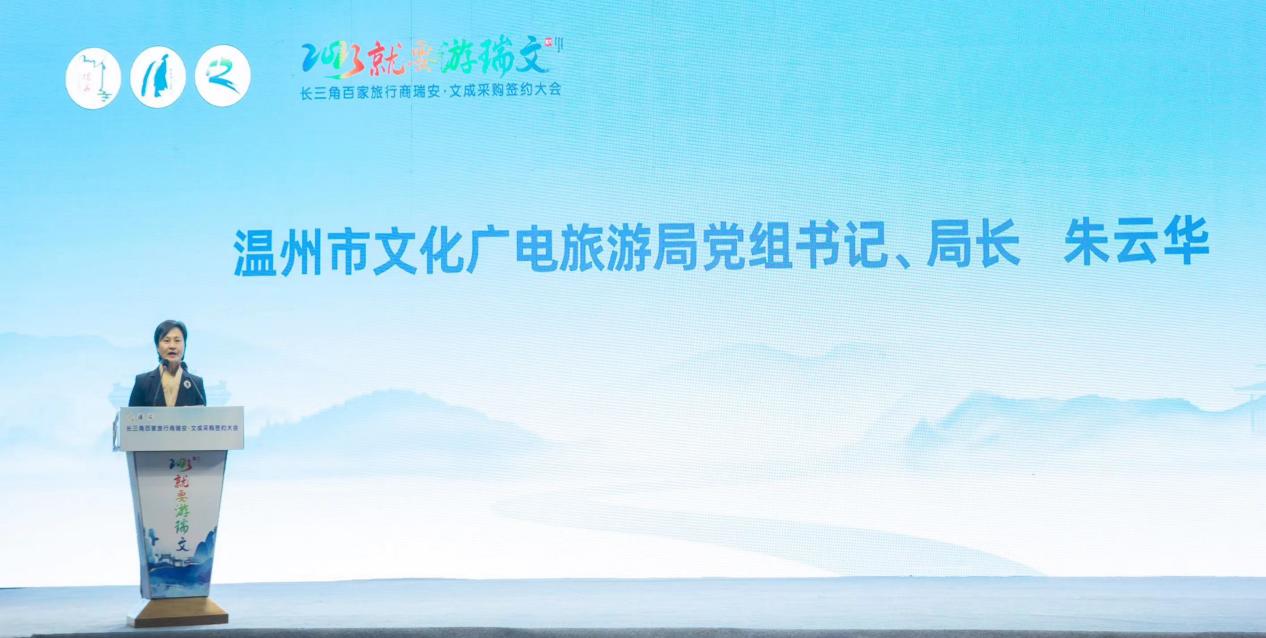 温州市文化广电旅游局局长朱云华在致辞中表示,近年来,正是由于瑞安、文成两地文旅部门的“务实工作”和“精心部署”,两地文旅市场稳固而活跃,文旅基础设施不断完善,旅游产品日益丰富, 2023长三角百家旅行商瑞安文成采购签约大会,就是全国旅行商友好力量对瑞安文成旅游市场走出浙江、走向长三角,拓展全国市场的又一次鼎力支持之举。今年,温州文旅已经全国游客发出“2023我要游温州”的盛情邀约,希望瑞安的人文古韵、文成的休闲惬意,能够吸引更多的长三角客人。