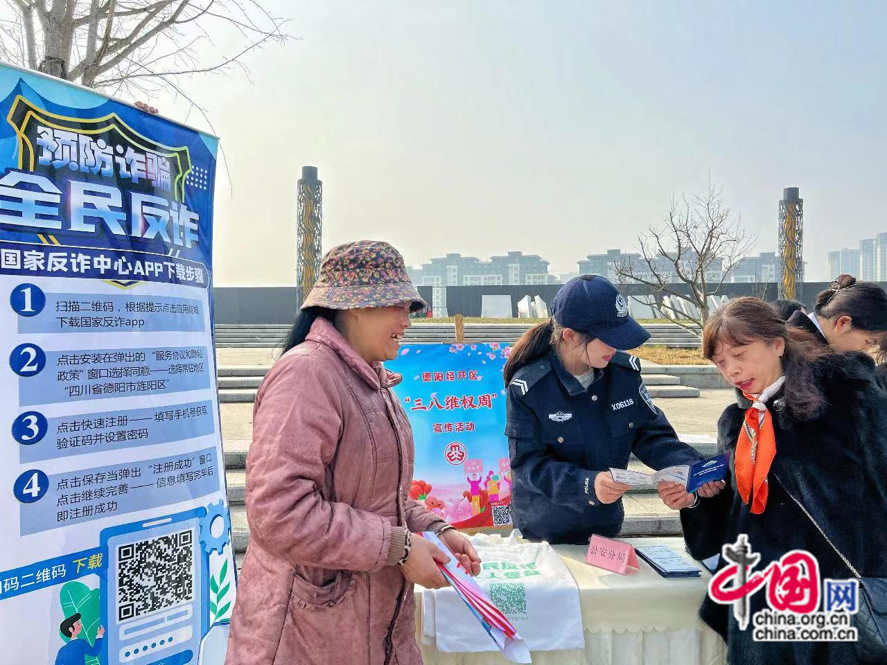 为守护好老百姓的“钱袋子”,打好“反诈预防针”,在“三八”妇女节来临之际,3月3日,德阳市公安局经开区分局反诈中心携手德阳经开区妇联开展反诈宣传活动。