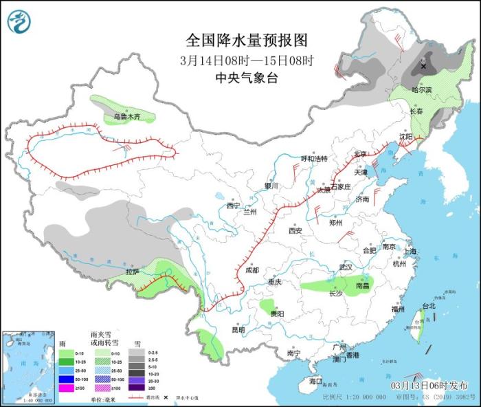 3月13日08时至14日08时,新疆沿天山地区、西藏北部和南部、黑龙江东北部等地部分地区有小到中雪或雨夹雪,其中,新疆沿天山地区、黑龙江东北部等地部分地区有大雪(5~8毫米);新疆天山北麓和伊犁河谷、西藏东南部、川西高原南部、云南中南部等地部分地区有小雨,局部中雨。内蒙古西部和中部、黑龙江东北部、山东、河南东部、辽东半岛、浙江东部等地部分地区有4~6级风。东海南部、台湾海峡、巴士海峡、南海东北部有7~8级、阵风9级的东北风,其中台湾海峡部分海域的风力可达9级、阵风10级。