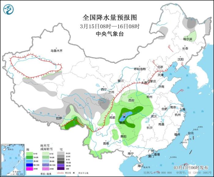 3月15日08时至16日08时,西藏南部和东部、青海南部、甘肃东部、川西高原北部、陕西南部、黑龙江中部和北部等地部分地区有小到中雪或雨夹雪;西藏东南部、西北地区东南部、黄淮西部、江汉大部、湖南西部、西南地区东部、云南西南部等地部分地区有小到中雨,其中,四川盆地东北部、重庆西部和北部等地部分地区有大雨(25~40毫米)。内蒙古东部、河北北部、东北地区等地部分地区有4~6级风。黄海大部有5~7级风、阵风8级。