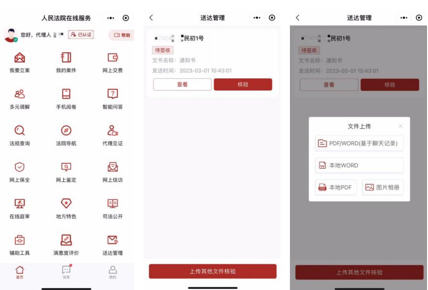 1、访问“人民法院在线服务”小程序,在首页选择“送达管理”,在“送达管理”界面,点击“上传其他文件核验”,选择任一文件上传方式进行核验。