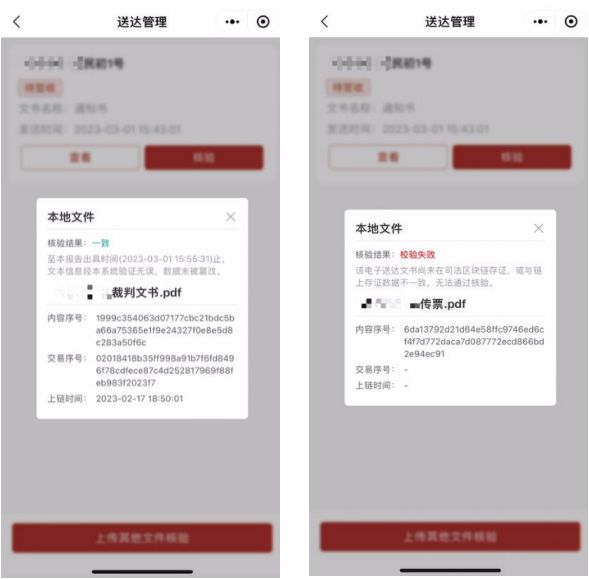 对于验证不通过的文件,将提示“该电子送达文书尚未在司法区块链存证,或与链上存证数据不一致,无法通过核验”;