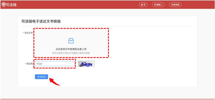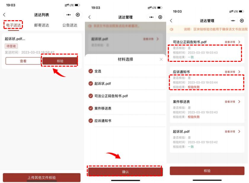 当事人及社会第三方机构接收到相关部门发送的电子送达文书后,可访问互联网司法链平台、人民法院在线服务小程序,对电子送达文书进行在线核验。核验操作流程如下: