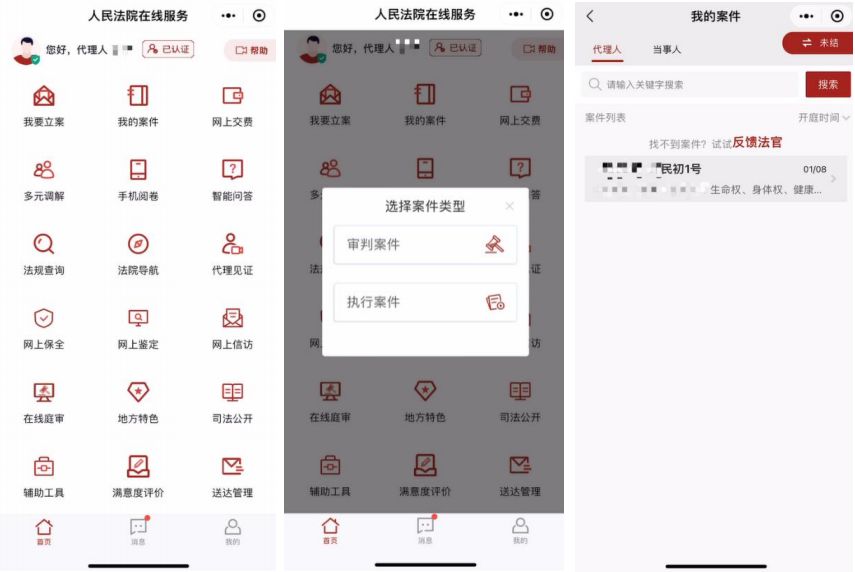 1、访问“人民法院在线服务”小程序,首页点击“我的案件”,选择案件类型,在“我的案件”页面的案件列表中点击审判或执行案件。