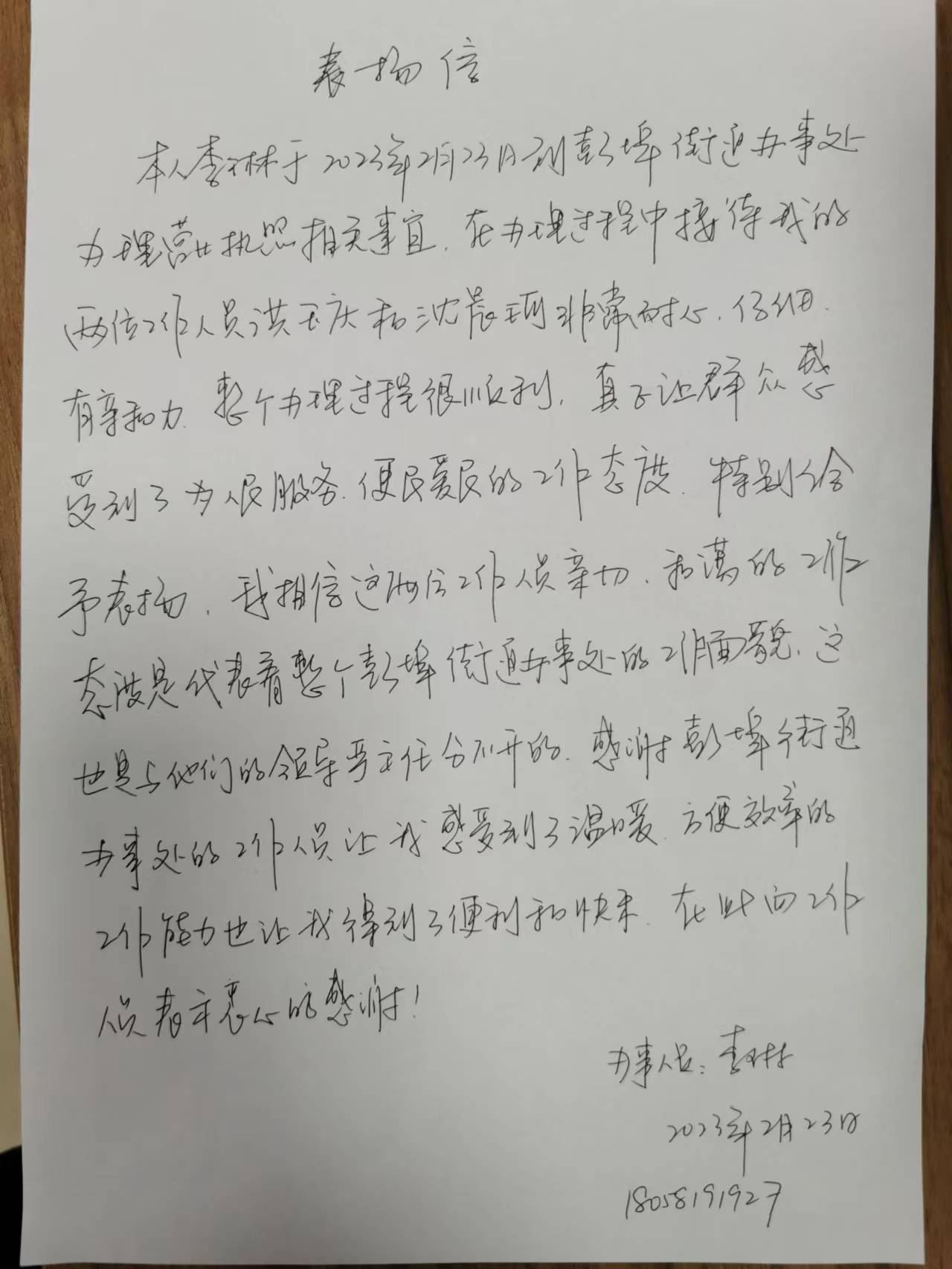表扬信承载着办事群众对我街道办事工作人员的充分肯定,更是对中心积极践行“跑一个窗、进一扇门、办万家事”工作要求的殷切期待。在珍惜荣誉的同时,也将进一步激励和鞭策我们在今后的工作中继续发扬优良传统,让办事群众真正享受到更加优质、快捷、高效的政务服务。作者:平华