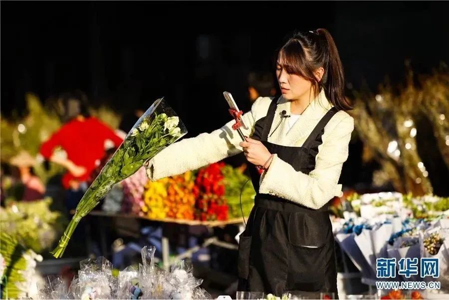 电商主播毕茜茜正在斗南花卉市场进行直播(摄于2月13日)。新华网 赵普凡 摄