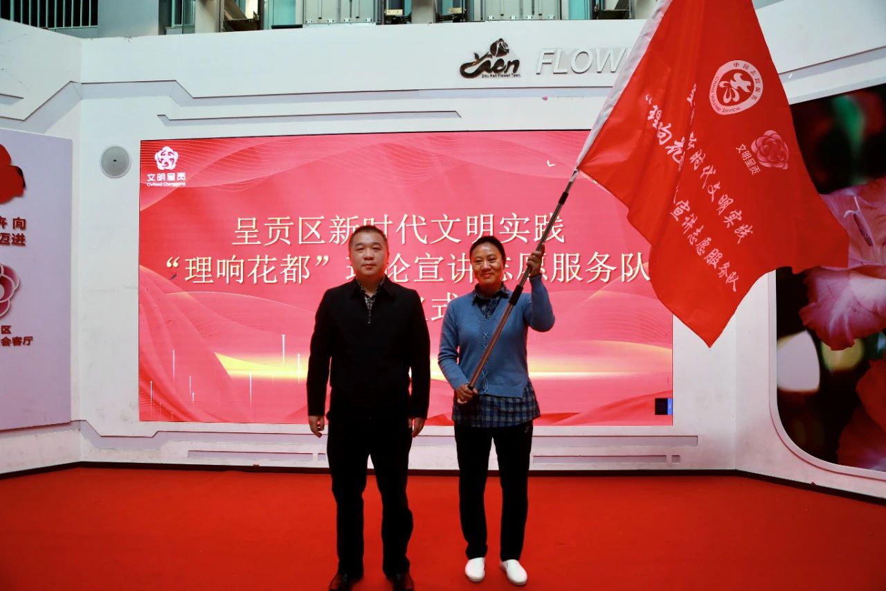 呈贡区政协副主席王毅强为呈贡区新时代文明实践“理响花都”理论宣讲志愿服务队授旗。