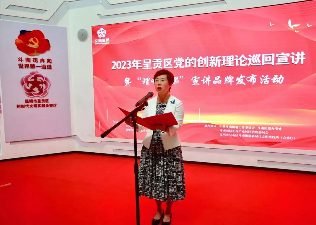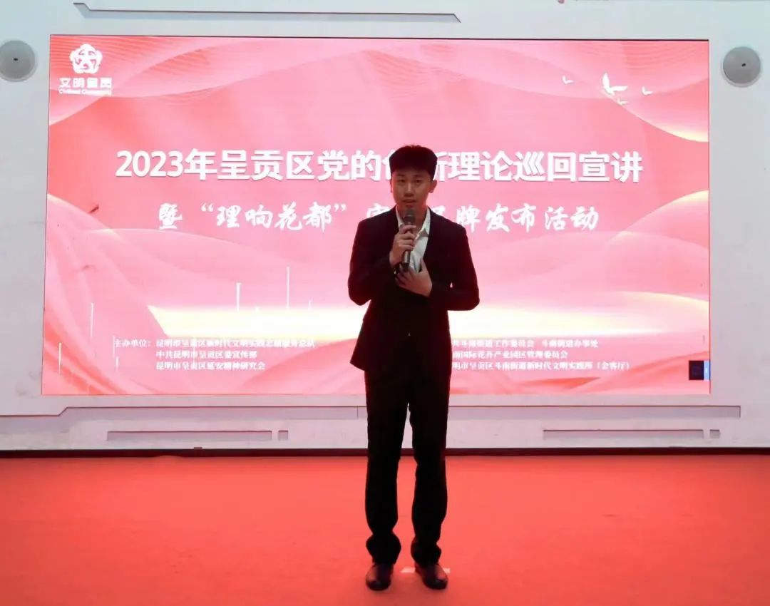 今天我们在这里开展呈贡区党的创新理论巡回宣讲,实际上也是我们呈贡区理论“六进”的其中之一项活动——理论宣讲进企业。那么今天我们同时还发布了“理响花都”宣讲品牌,在呈贡这是个梦想花开的地方,通过“理响花都”品牌我们将进一步开展党的创新理论宣讲让它深入万家,同时结合呈贡区新时代文明实践志愿服务活动广泛开展,也将在这个品牌之下呈现我们呈贡的自然之美和人文情怀。