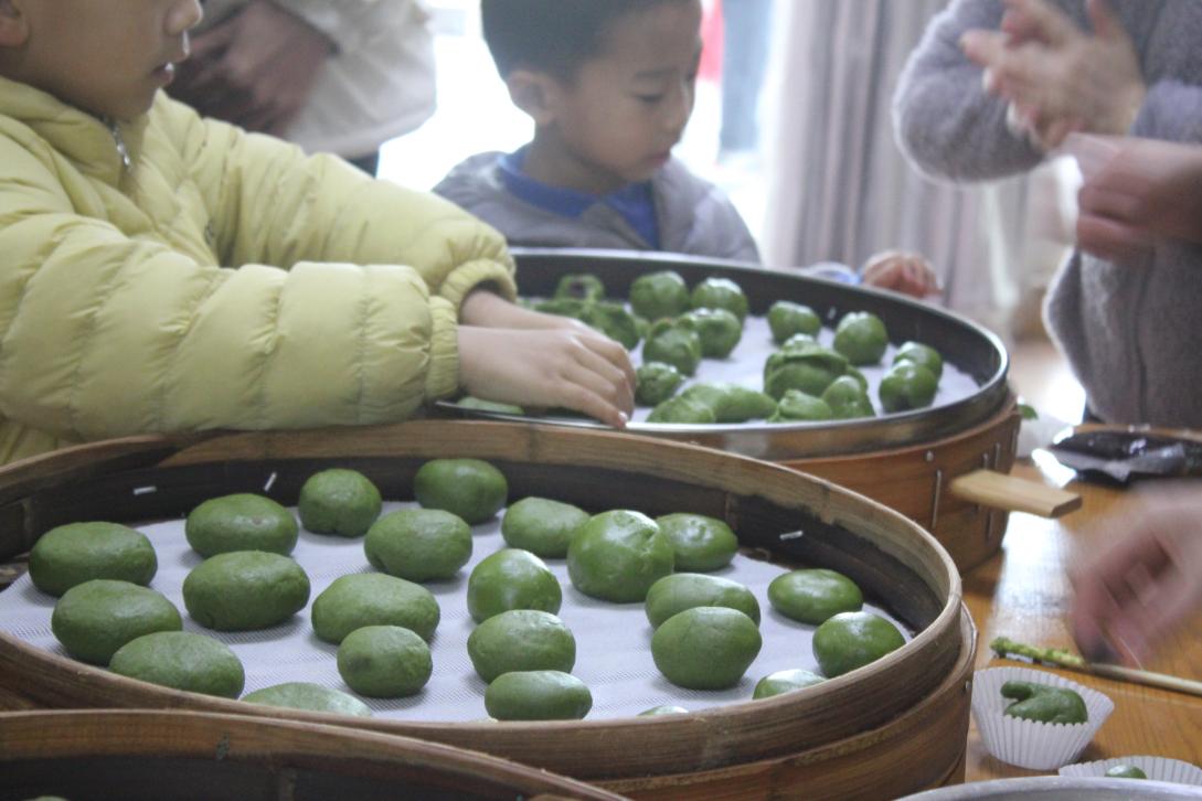“大家想知道青团是怎么制作而成的吗?”“想!”孩子们异口同声的说。于是工作人员拿出了制作青团的糯米粉、艾草,豆沙馅等物料,并详细的向大家讲解制作青团的步骤。在老师的示范下,孩子和家长一起动手学做青团。只见孩子们小心翼翼地把艾叶汁倒入糯米粉中,然后揉粉、和面、再捏出一个个圆圆的可爱团子,最后包入适量的豆沙馅,油绿成玉的青团就制作成功啦!他们还充分发挥了自己的创造能力,制作出了形状各异的青团。