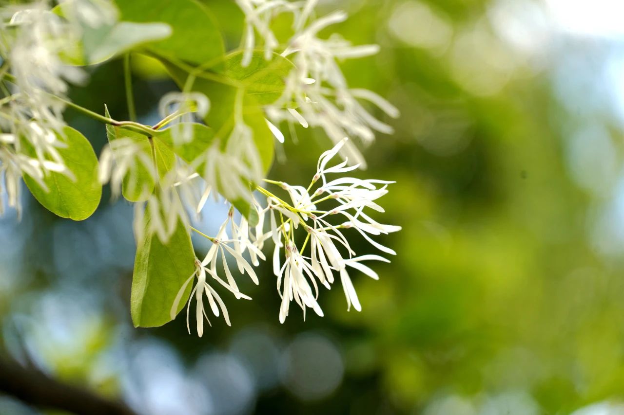 流苏树花冠白色又叫“四月雪”,像个倒挂的小伞,又像古代仕女服饰的流苏,因此而得名。