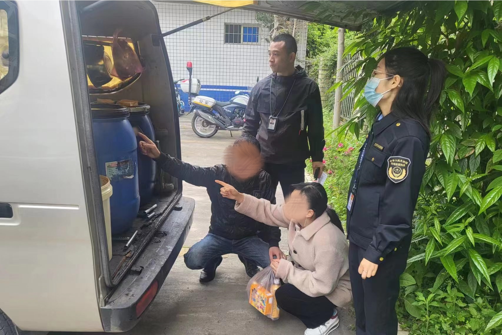 “行动!”随着蹲点守候多日的洪川派出所所长杨帆一声令下,两名犯罪嫌疑人被民警当场抓获,现场扣押涉案面包车一辆、水趸一台(套)、捞网、电筒等作案工具。经民警现场观察,涉事面包车车厢后部完全隔离密封,与正常面包车无异,但当民警打开车厢后却发现另有乾坤——车厢内存放有10个用来收集地沟油的大桶,里面均已经装满黄色油样膏状物。