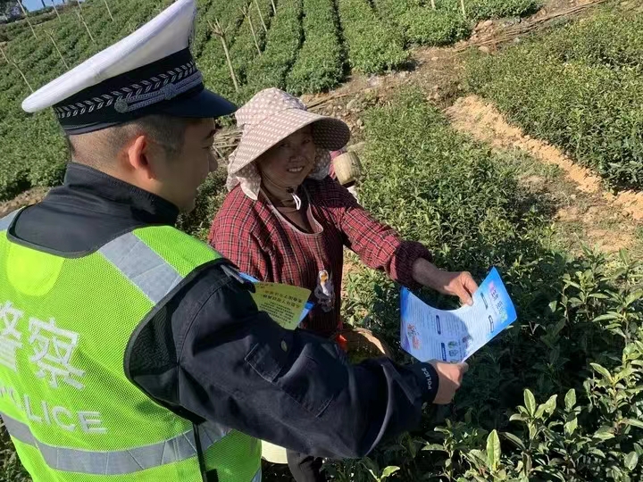 活动中,宣传民警来到茶山上,通过发放宣传资料、现场解疑答惑、赠送小礼品等形式向茶农们开展了道路交通安全宣传。宣传民警采用通俗易懂的语言,向茶农们详细讲解了道路交通安全法律法规和农村道路交通安全常识,通过以案释法,重点讲解酒后驾驶、无牌无证驾驶、农用车违规载人等农村常见交通违法行为的危害和后果,引导群众不违规乘坐农用车和三轮车,时刻把安全放在首位,杜绝一切交通违法行为的发生,自觉摒弃各类交通陋习,切实做到交通安全与农忙采茶两不误。