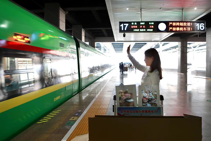 “把呈贡的浪漫带到万象!”旅客们手捧花束喊着,随着D887次“复兴号”动车组缓缓驶出昆明南站,空气中飘起一阵芳香。