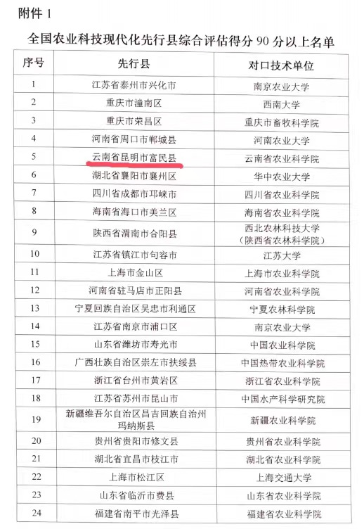 4月17日,农业农村部科技教育司发布关于2022年全国农业科技现代化先行县共建工作评估结果的通报,24个县(市、区)评估得分在90分以上。其中,云南省富民县综合评估在全国72个先行县中排名第5,成为共建县区中24个首批“全国农业科技现代化先行县”之一。