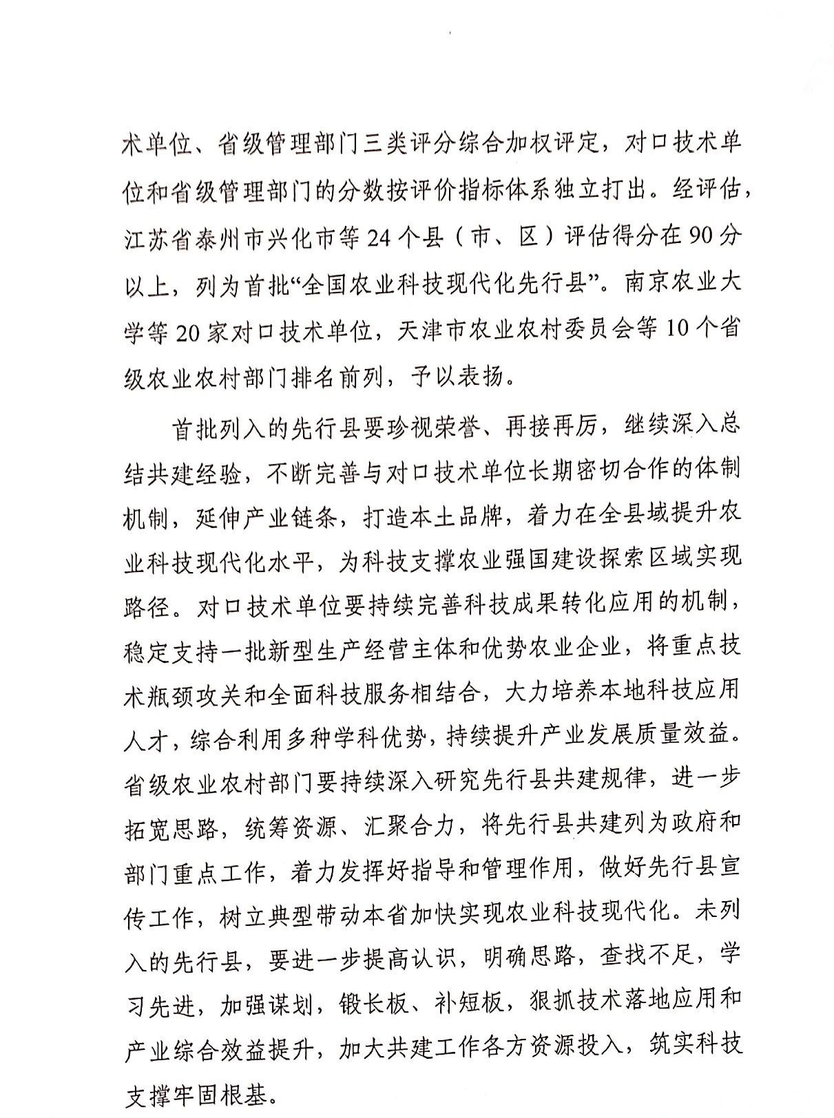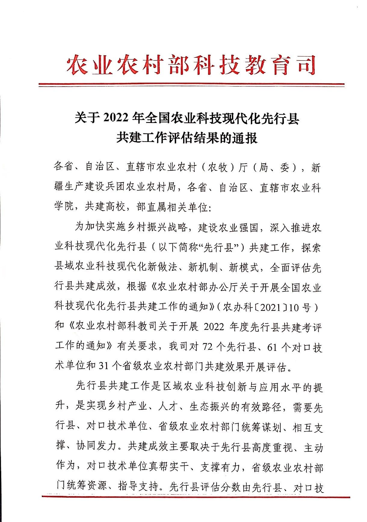 2021年5月,农业农村部办公厅印发《关于开展全国农业科技现代化先行县共建工作的通知》,以涉农科研院所、高等院校为对口技术单位,拟在全国范围内共建72个农业科技现代化先行县。