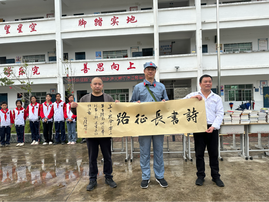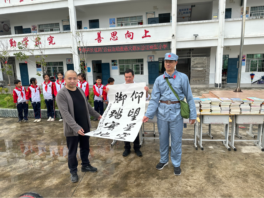 4月19日上午,诗书长征路第二期全体成员来到位于于都县澄江村的火箭军澄江希望小学,举行了以“诗书育人,走好新时代长征路”为主题的公益活动。中国书法家协会会员、江西省书法家协会行书委员会主任、赣州市书法协会主席张声林来到活动现场,在华文众合智慧书法教室中,为火箭军澄江希望小学的孩子们写下“仰望星空,脚踏实地”的学校校训,并为本期诗书长征路活动题字。