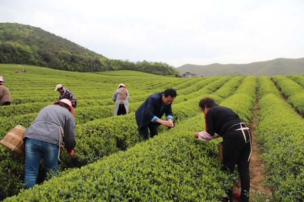 宜兴烟草客户经理(左二)帮茶农采摘茶叶