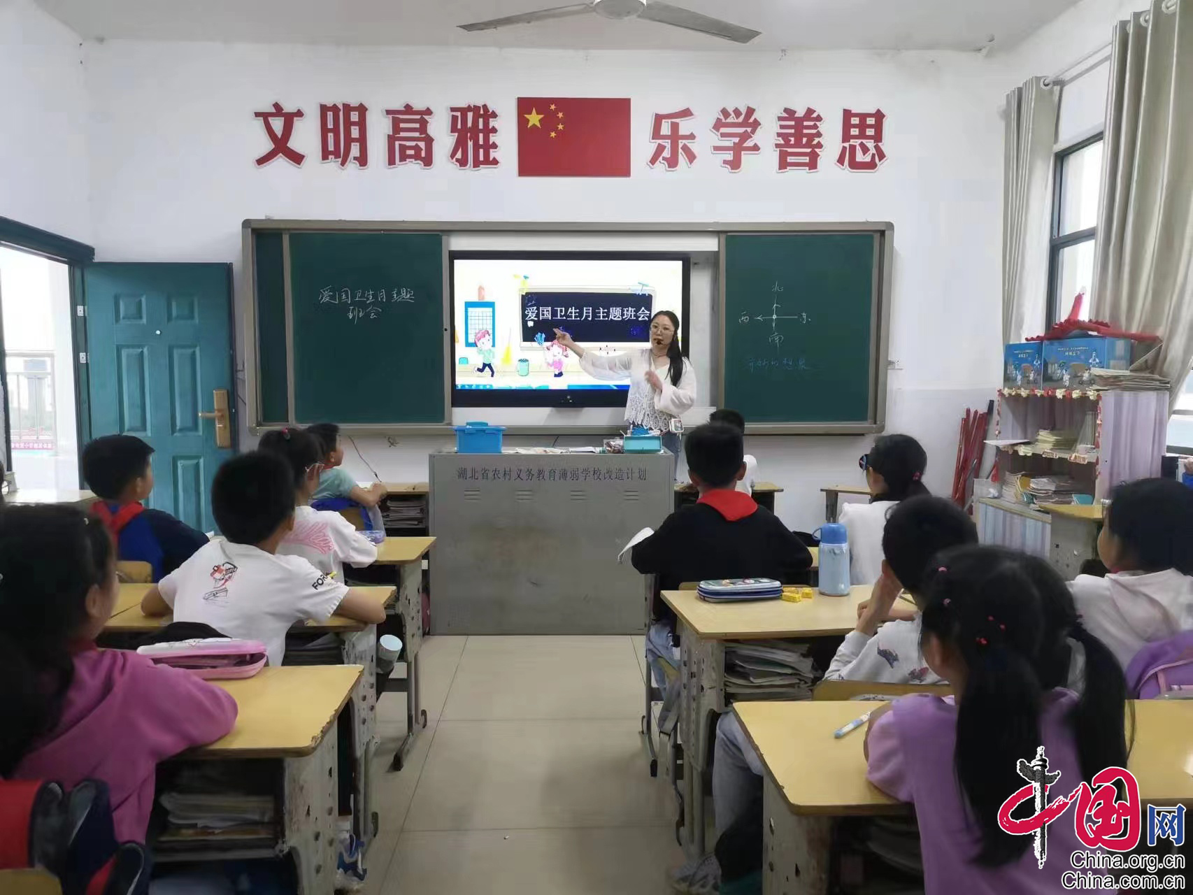 主题板报宣传爱卫知识。各班通过收集整理爱国卫生和垃圾分类等方面的知识,设计出一版版新颖、图文并茂和知识性强的板报。学校大门口LED电子屏幕全天滚动播放爱国卫生月标语。