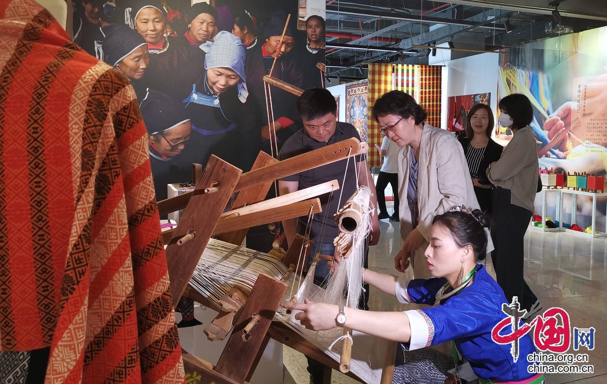 图二:湖南侗锦非遗传承人石耐群向观众展示织锦技艺。