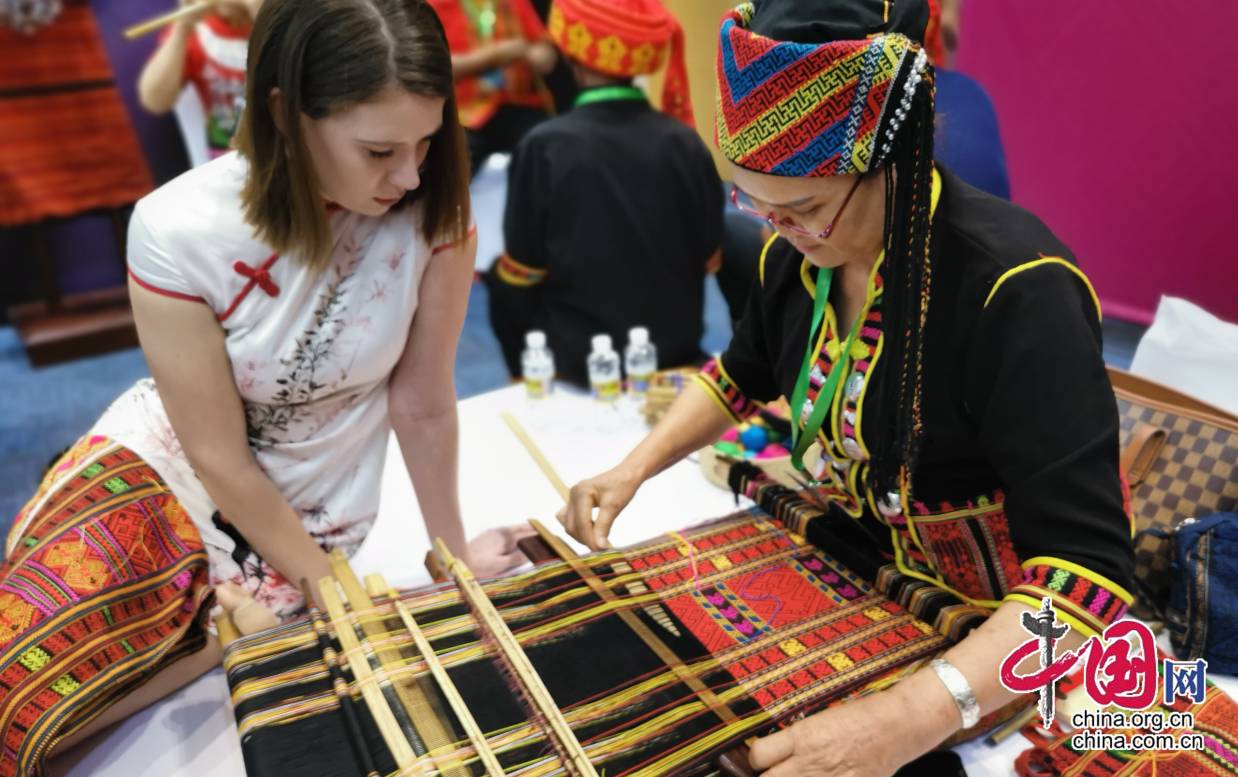 图一:海南黎锦非遗传承人与外国友人促膝而谈。