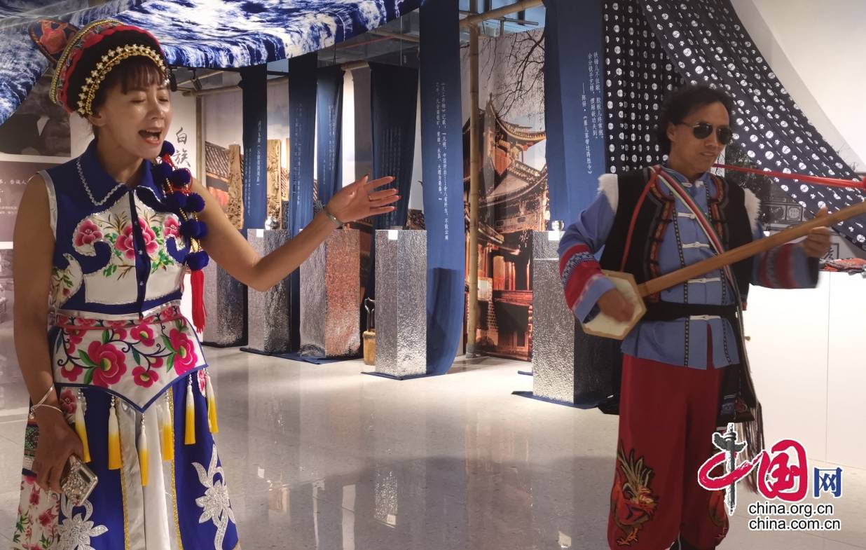 在非遗传承人段袁的白族扎染展前合唱《东山放羊调》白族调。