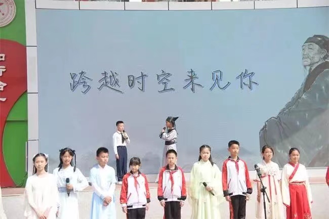 六年级的同学们在老师们的引领下,以白居易、李白、苏轼、刘禹锡和节日为主题进行了一系列的活动,通过古诗文联诵的形式“读经典、背经典、悟经典”,他们还编创了情景剧《穿越时空的对话》《乌台诗案》,用通俗易懂的形式弘扬传统文化。