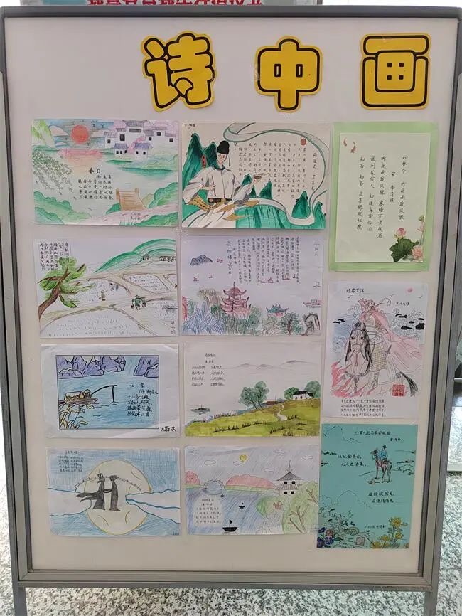 活动期间,学校还举行了传统文化的展览活动,每个年级的同学通过书写、绘画、设计等形式制作了和诗词相关的作品。