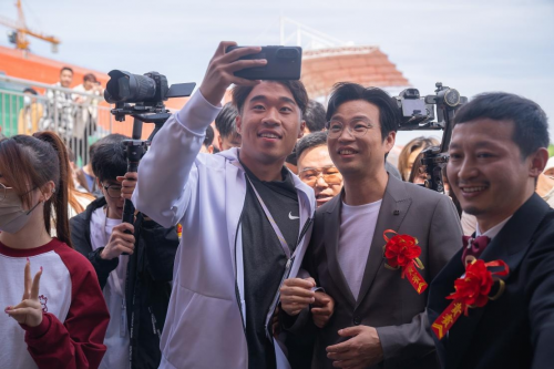 演员王迅与在场的师生互动,并合影留念。