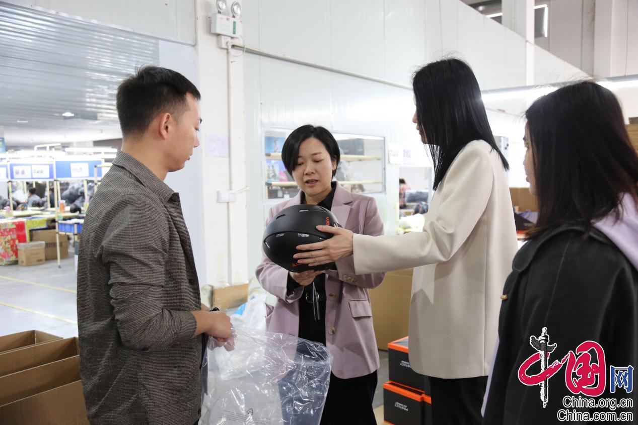 走访中,余菁一行实地参观了企业的喷漆车间、半成品生产车间、头盔组装车间。在头盔组装车间,工人们正在赶制头盔订单,贴搭扣、粘标签、装排笔、上吊卡、打包装箱,每道工序无缝对接,配合默契。据该公司副总经理张龙威介绍,为保障产品品质,每一件产品要通过30多项测试后才能出厂。