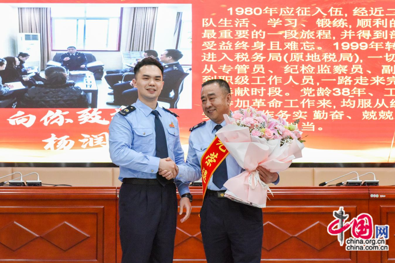 薪火相传、礼敬韶华。在《中国税务老干部之歌》歌声中,8名退休老干部佩戴光荣退休绶带闪亮登场,8名青年“徒弟”分别送上鲜花、握手致敬、传递力量。