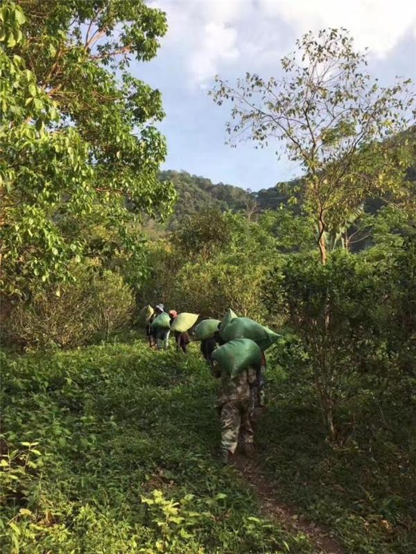 (从刮风寨普洱茶王树上采摘的原叶,全靠人力背下山)